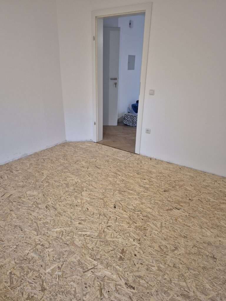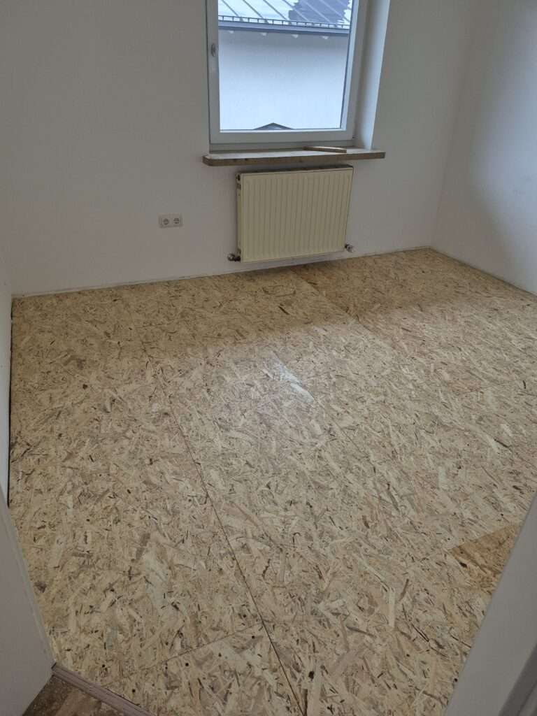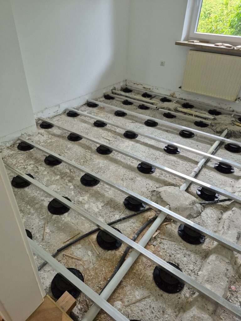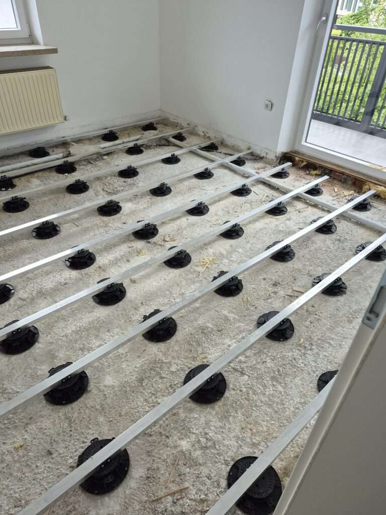 Im Rahmen professioneller Vorbereitungsarbeiten wurde hier eine tragfähige Fläche geschaffen: 18 mm starke OSB-Platten wurden doppelt auf Stelzlager verlegt und durch eine robuste Aluminium-Unterkonstruktion stabilisiert. Diese Lösung sorgt für einen sicheren, ebenen Untergrund – ideal für den weiteren Bodenaufbau oder als Basis für verschiedene Einsatzbereiche im Innen- und Außenbereich.