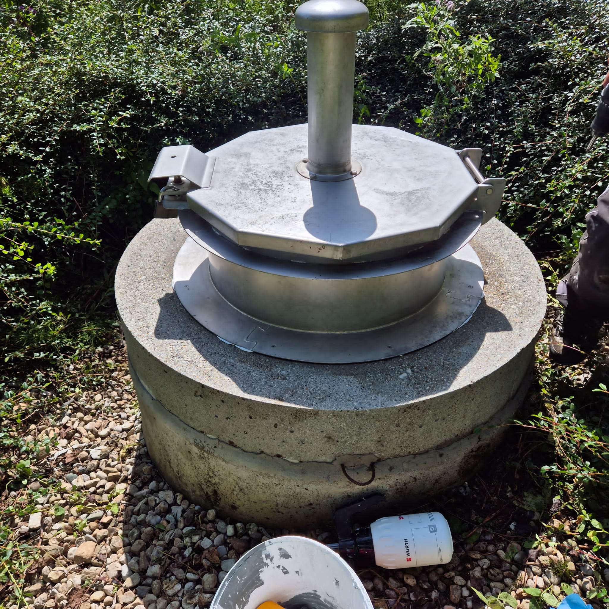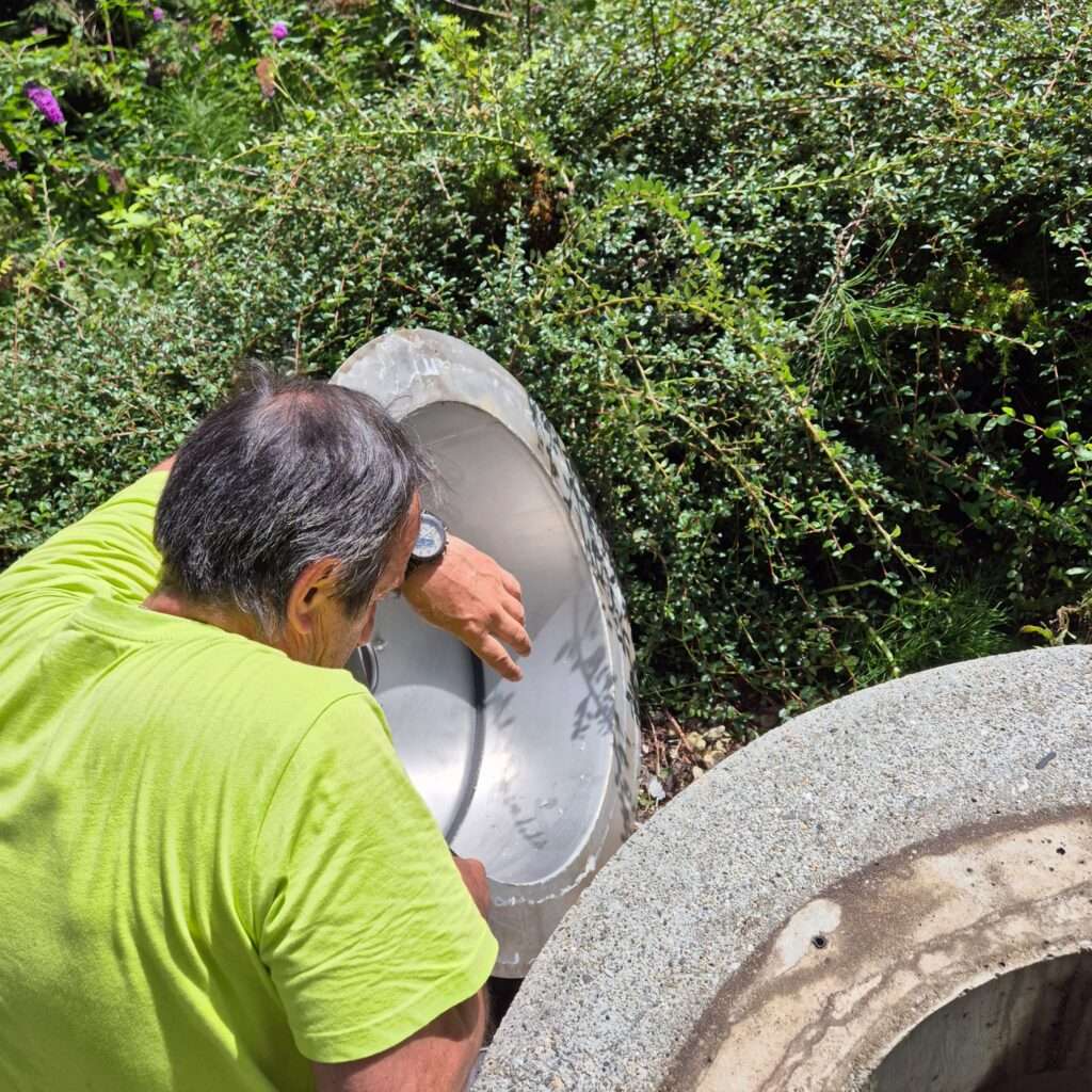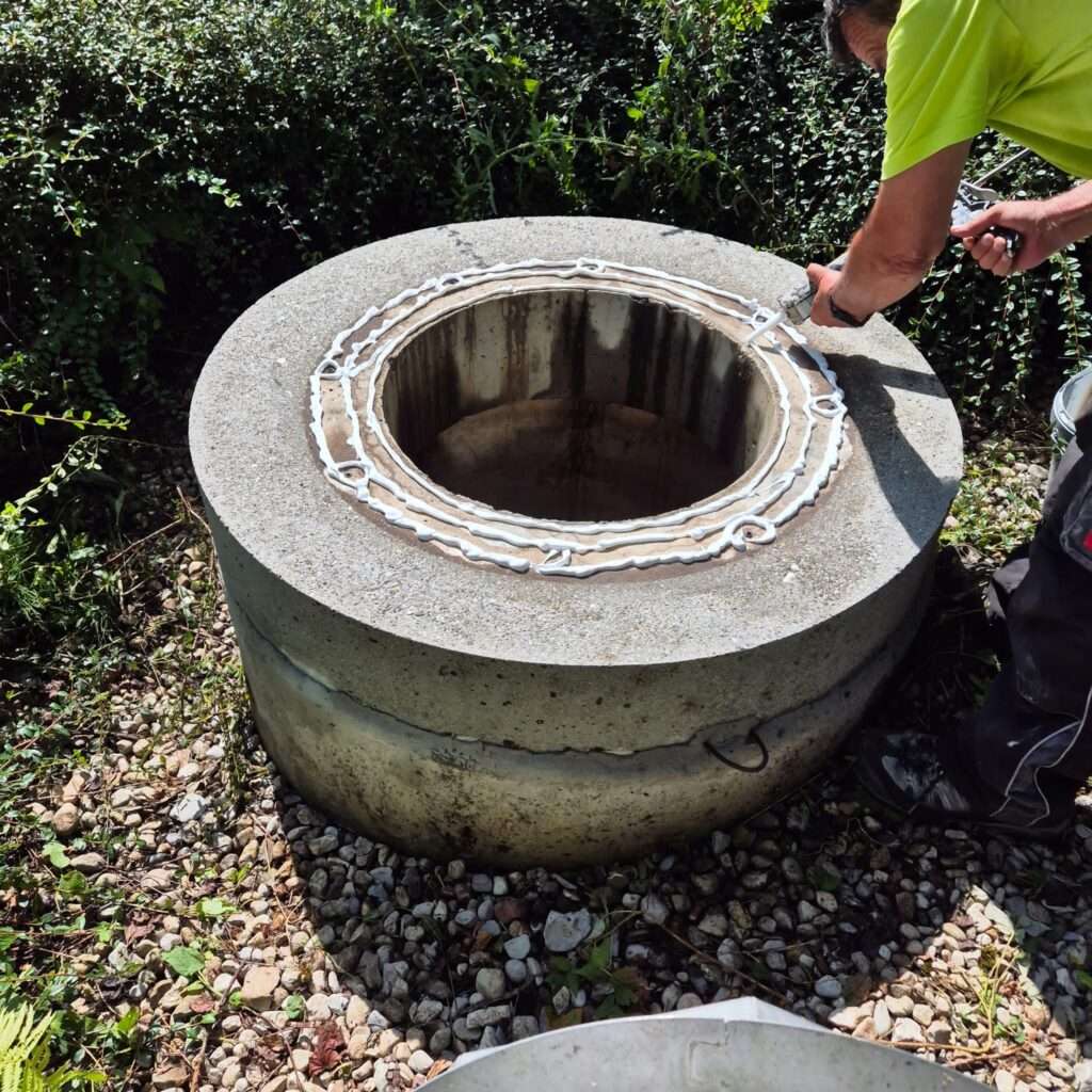 Die alte Abdichtung wurde vollständig entfernt und der Brunnen mit Innotec Ady-Sill neu abgedichtet – ein Dichtmittel, das für Trinkwasserbrunnen zugelassen ist. Zusätzlich haben wir abgelagerten Sand mit einem Spezialsauger aus dem Schacht entfernt. Ergebnis: eine saubere, dauerhaft dichte Lösung für klare Wasserqualität.