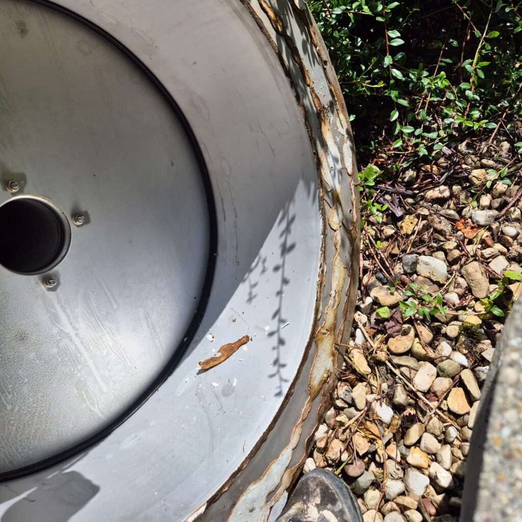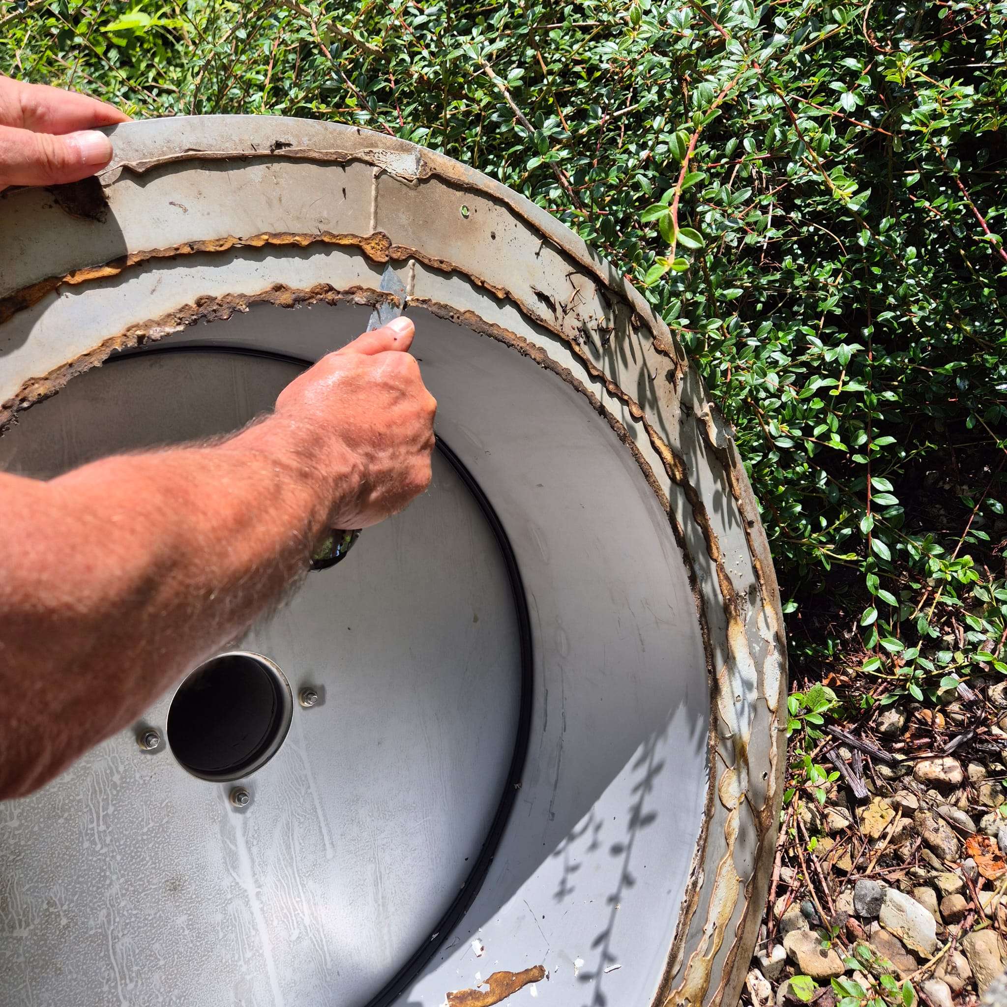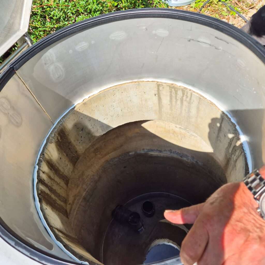Die alte Abdichtung wurde vollständig entfernt und der Brunnen mit Innotec Ady-Sill neu abgedichtet – ein Dichtmittel, das für Trinkwasserbrunnen zugelassen ist. Zusätzlich haben wir abgelagerten Sand mit einem Spezialsauger aus dem Schacht entfernt. Ergebnis: eine saubere, dauerhaft dichte Lösung für klare Wasserqualität.