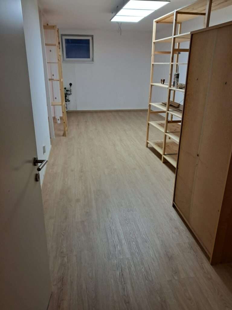 Nach einem Wasserschaden haben wir den alten Boden fachgerecht entsorgt und durch einen neuen, hochwertigen Vinylboden ersetzt. Zusätzlich wurden alle Kellerräume frisch gestrichen, um ein sauberes und freundliches Ambiente zu schaffen. Auch die Kamintüre am Dachboden sowie der Ofenanschluss im Keller wurden feuerfest verschlossen – für Sicherheit und ein rundum erneuertes Zuhause.