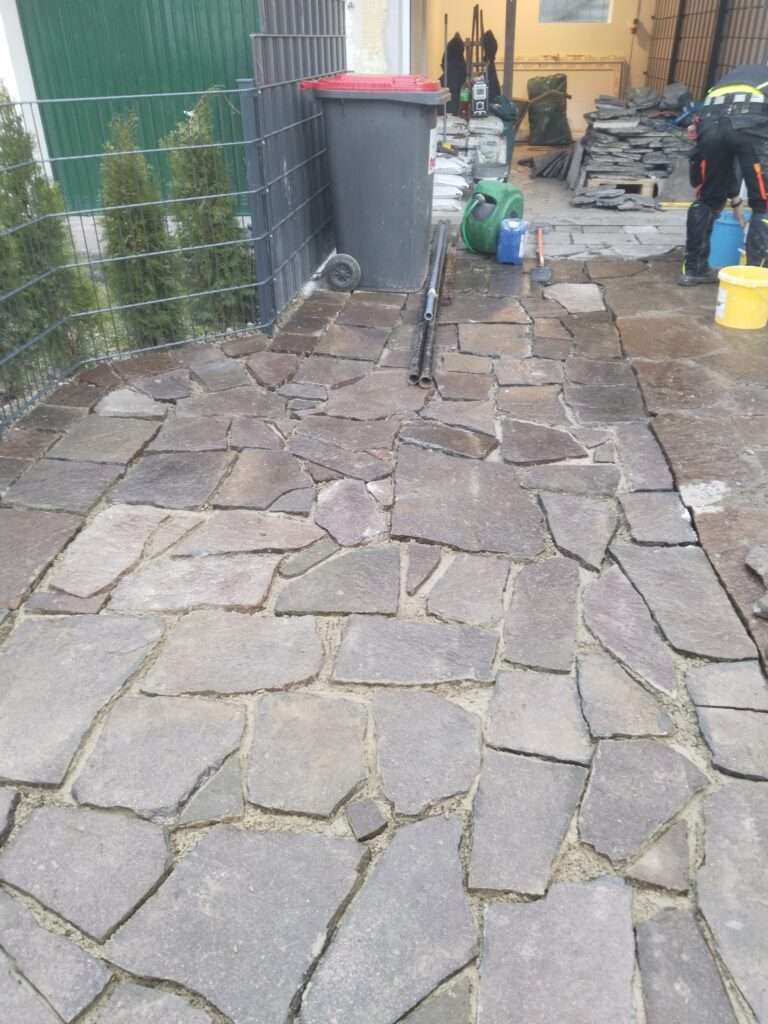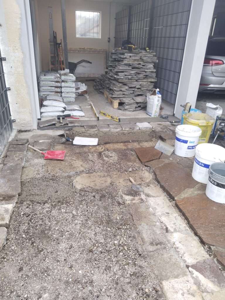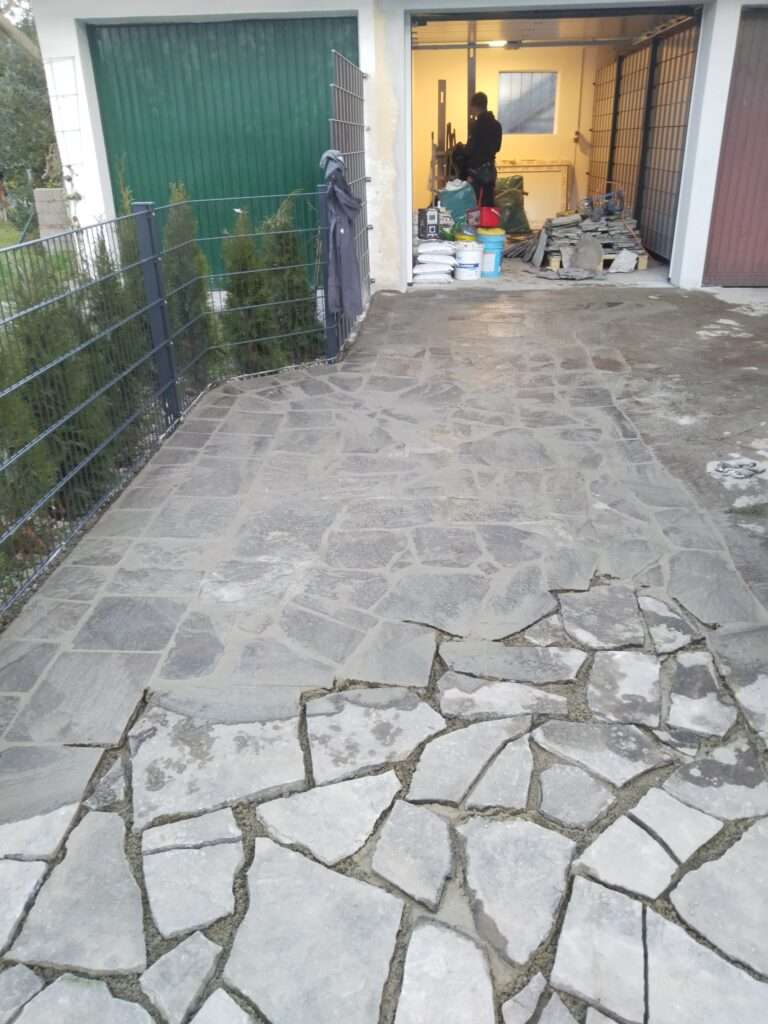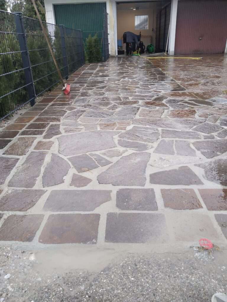 In Neu-Anif haben wir die Garageneinfahrt umfassend renoviert: Zunächst wurde der Bereich abgegraben und der Unterbau sorgfältig befestigt. Anschließend verlegten wir die Natursteine nass in nass, indem wir Trockenbeton und Fliesenkleber kombinierten. Die Fugen wurden präzise mit Fugenmörtel verfugt und die gesamte Fläche gründlich gewaschen, um ein makelloses Finish zu erzielen.
