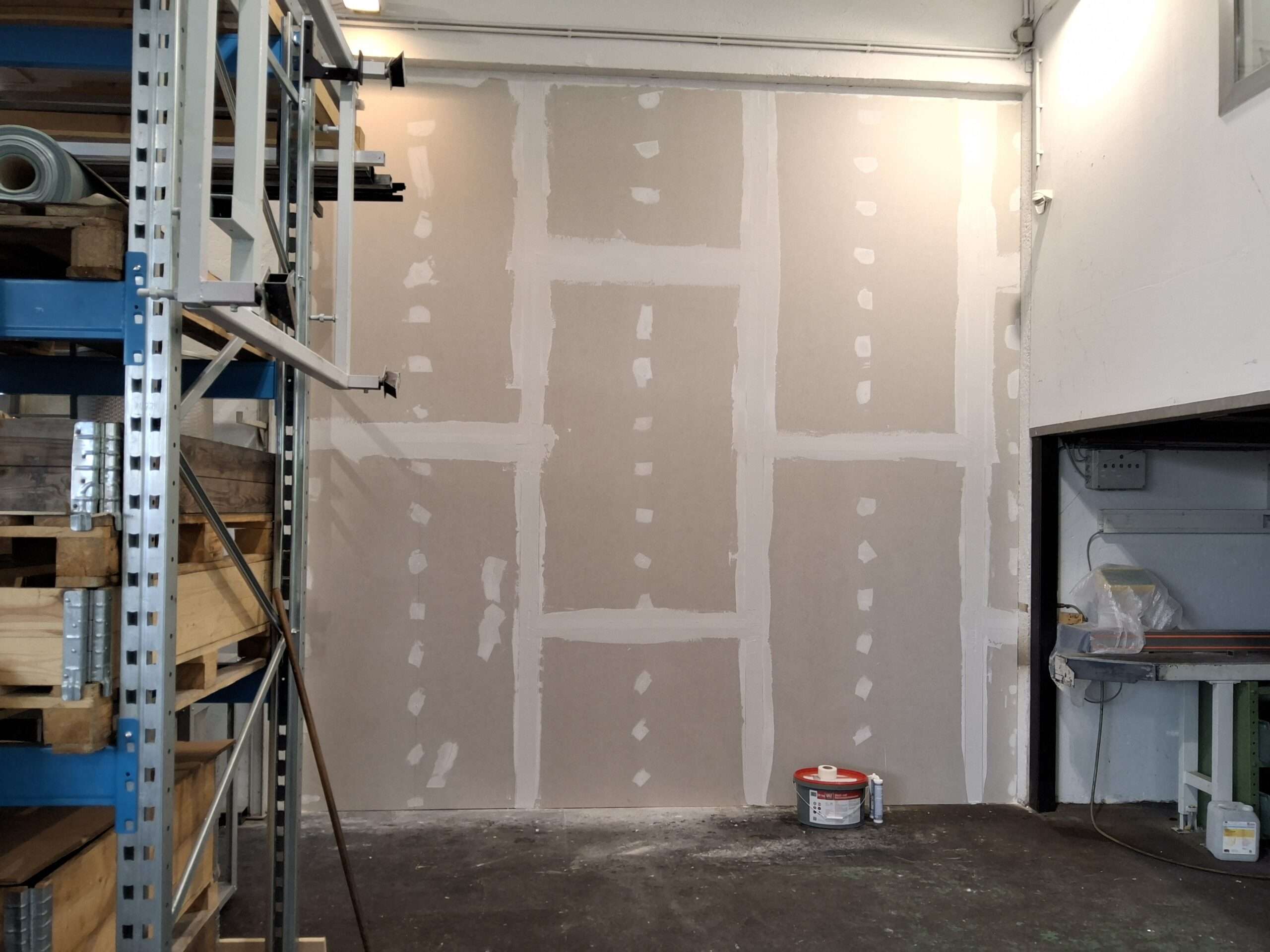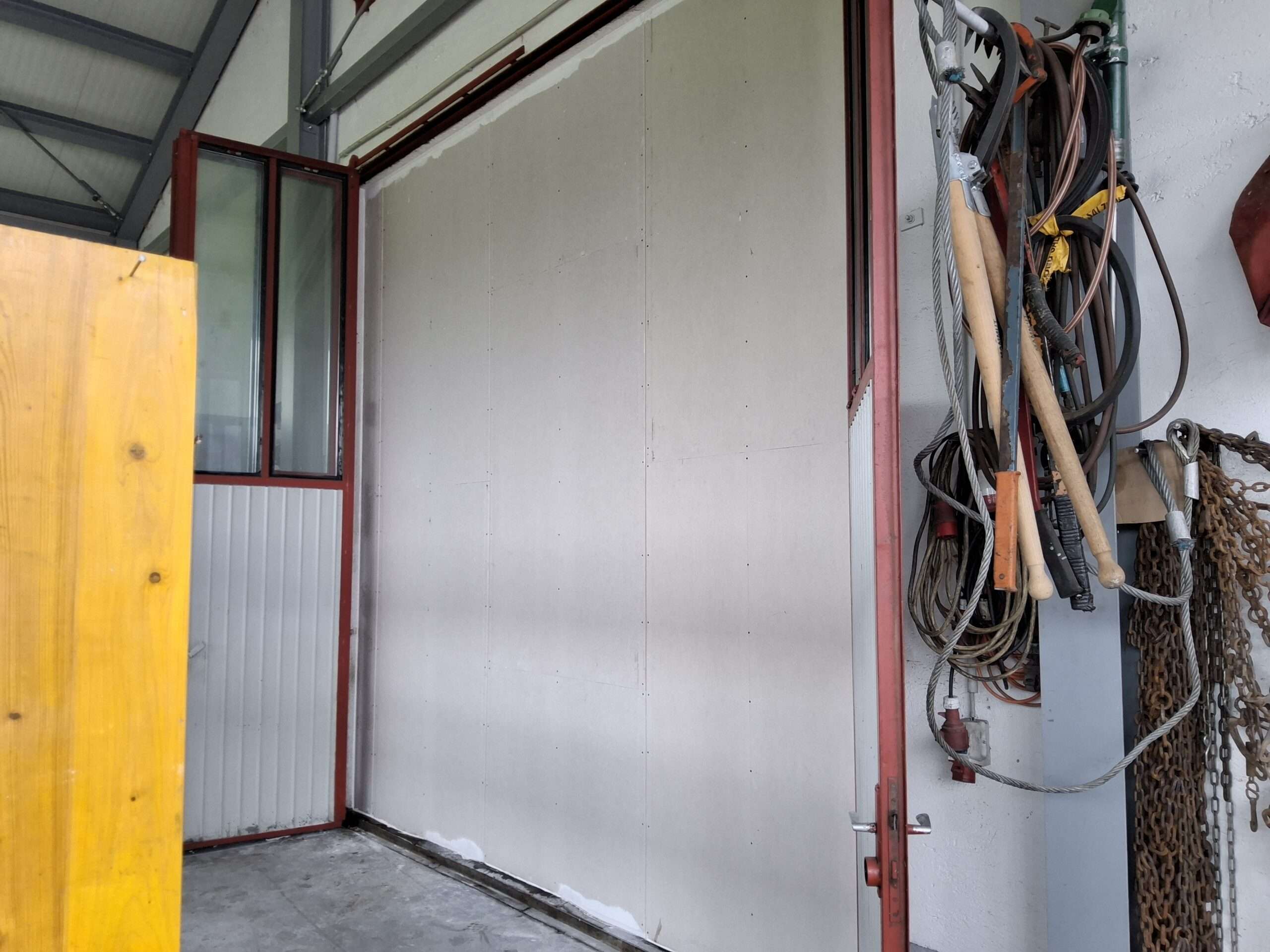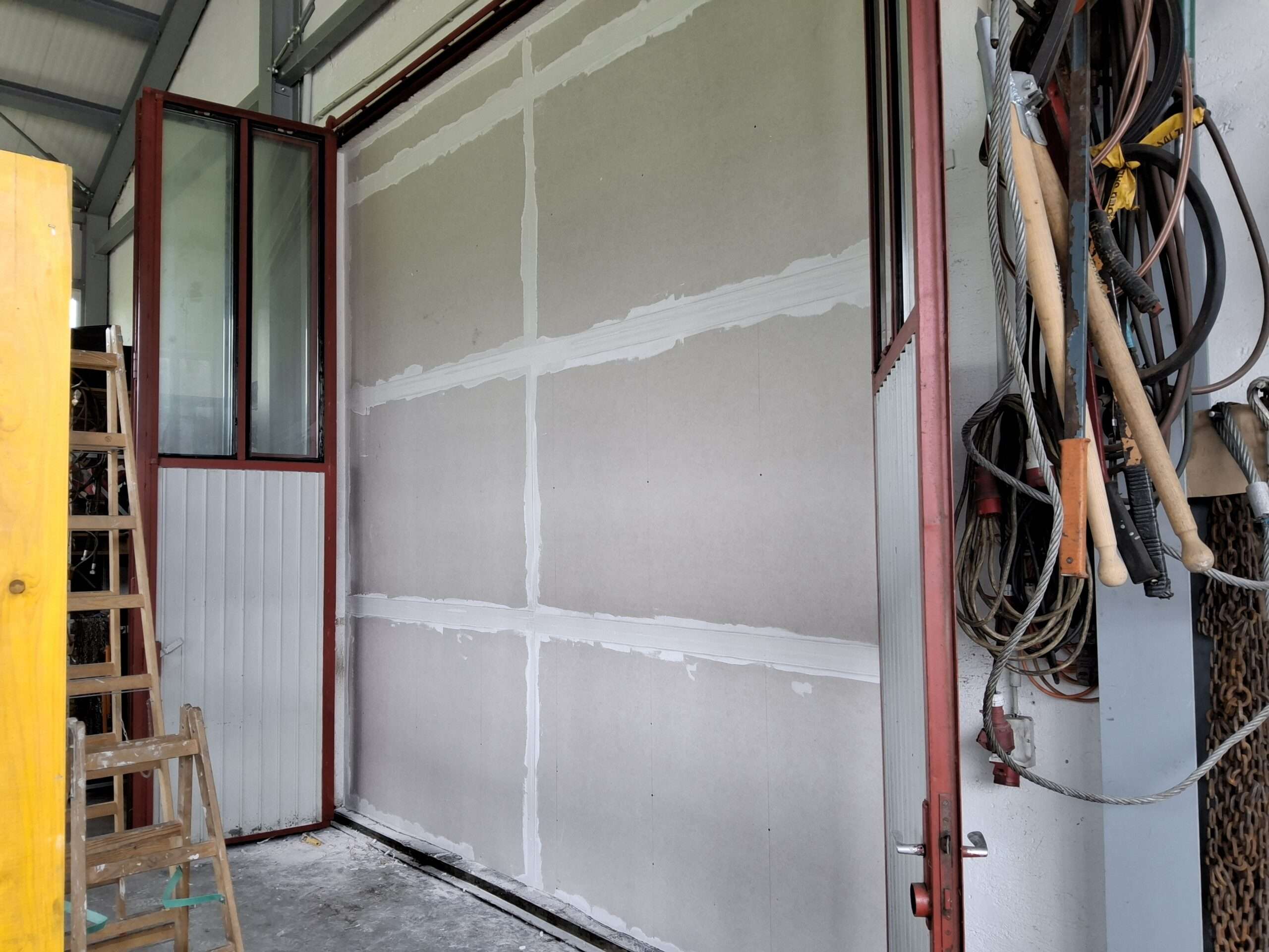 Eine Metalltür (4 m × 4 m) wurde mit einer doppelten Alu-Unterkonstruktion aufgebaut und beidseitig mit 3 × 15 mm GK-Feuerschutzplatten beplankt. Dazwischen sorgt 75 mm Dämmung für zusätzlichen Brandschutz und Schallschutz.
