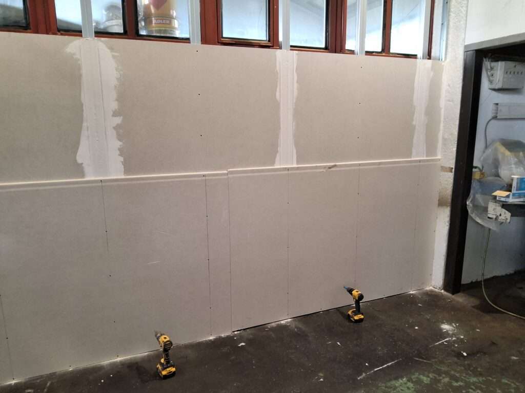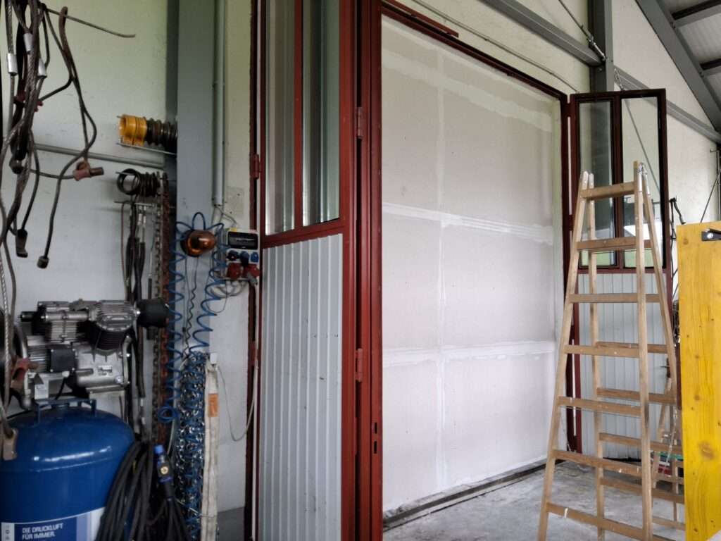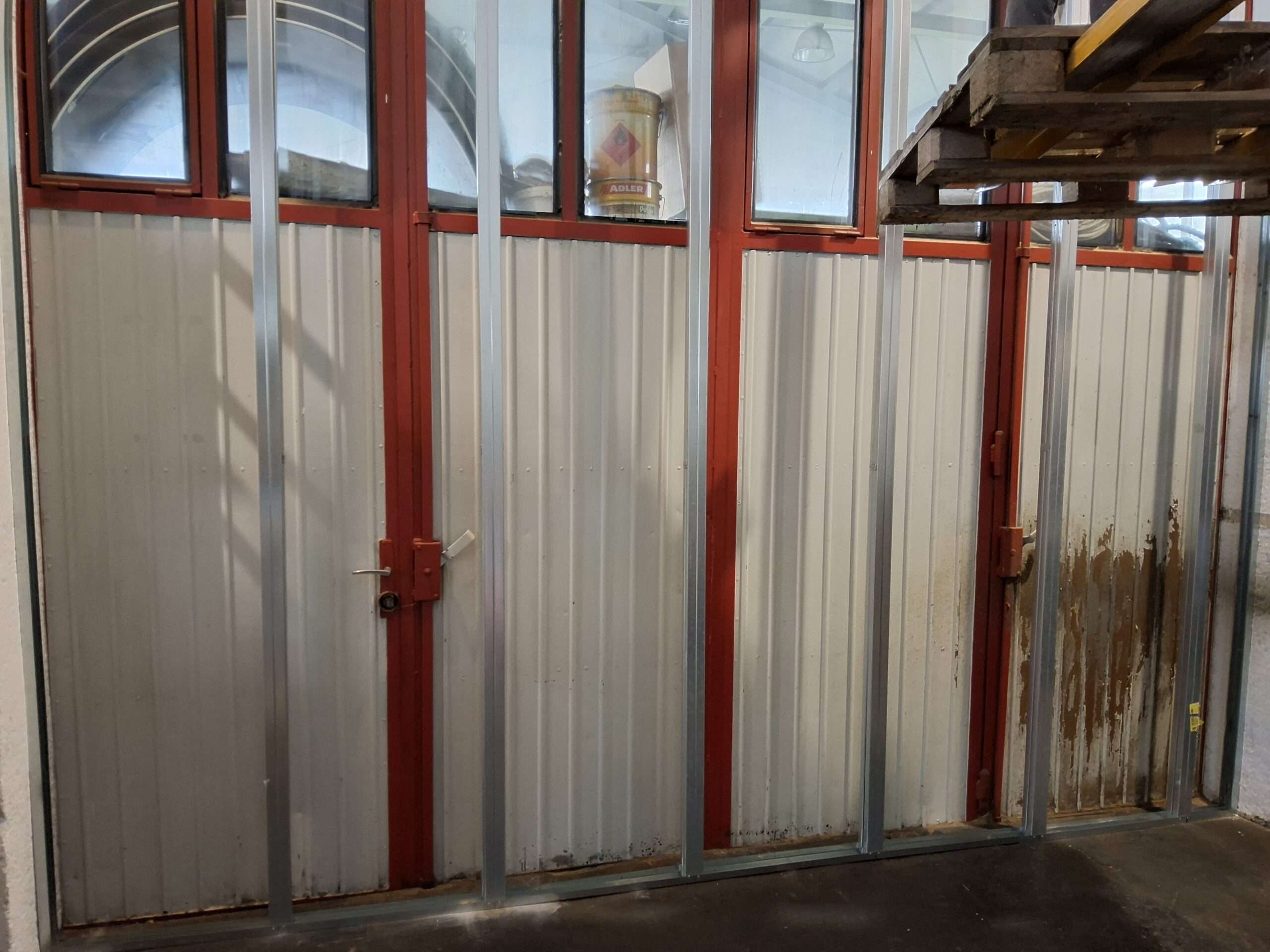 Eine Metalltür (4 m × 4 m) wurde mit einer doppelten Alu-Unterkonstruktion aufgebaut und beidseitig mit 3 × 15 mm GK-Feuerschutzplatten beplankt. Dazwischen sorgt 75 mm Dämmung für zusätzlichen Brandschutz und Schallschutz.