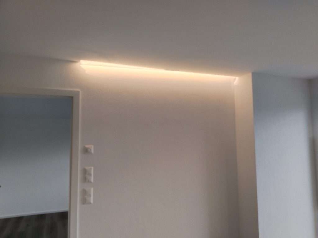 Die Fenster wurden teilweise zugemauert, während neue Fensteröffnungen geschaffen wurden. Neue Elektroleitungen und Wasserinstallationen wurden gestemmt und verlegt, und die Fensterleibungen wurden fachgerecht verputzt. Der Dachboden erhielt eine 30 cm dicke Isolierung. Für den Trockenbau, inklusive der Deckenkonstruktion mit indirekter Beleuchtung, sowie die Malerarbeiten zeichnete unser Team verantwortlich.