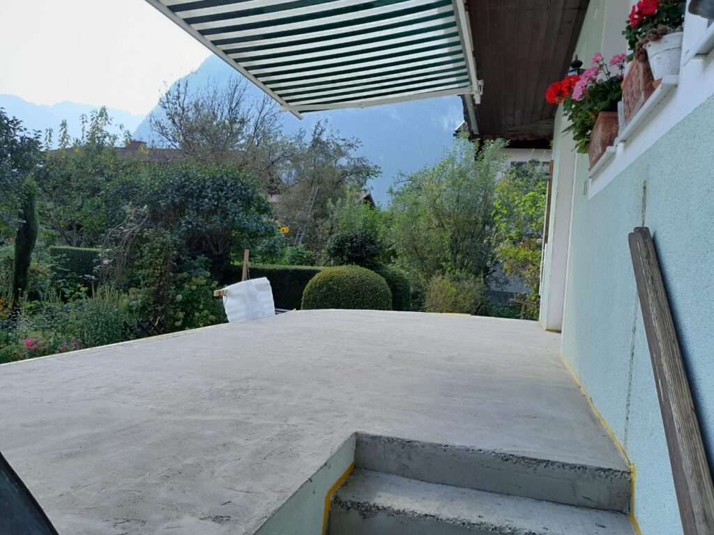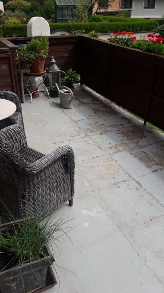 Bei diesem Projekt in Golling haben wir die Terrasse umfassend saniert. Zunächst schleiften wir die alte Oberfläche ab und trugen einen Mapei Haftgrund auf. Der Untergrund wurde mit Mapei Fast 330 nivelliert und an der Kante wurde eine Tropfnase montiert, um Wasserabfluss zu gewährleisten. Zur Abdichtung und Isolierung kam Mapei-Lastik 2K zum Einsatz.