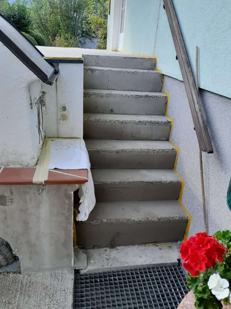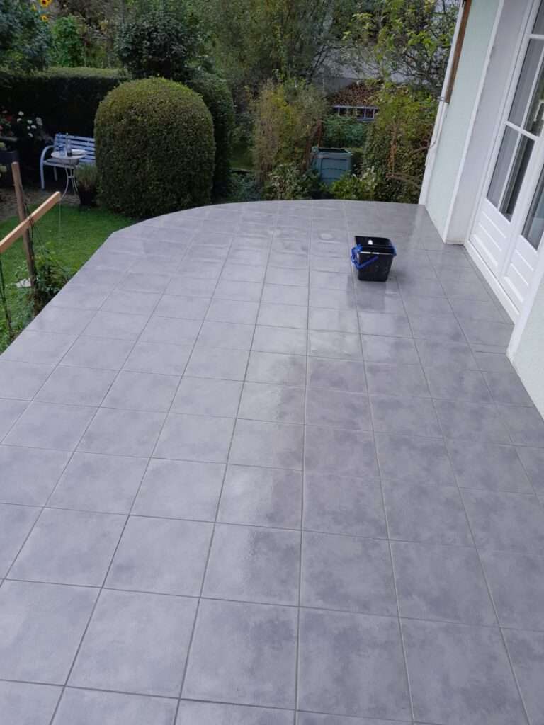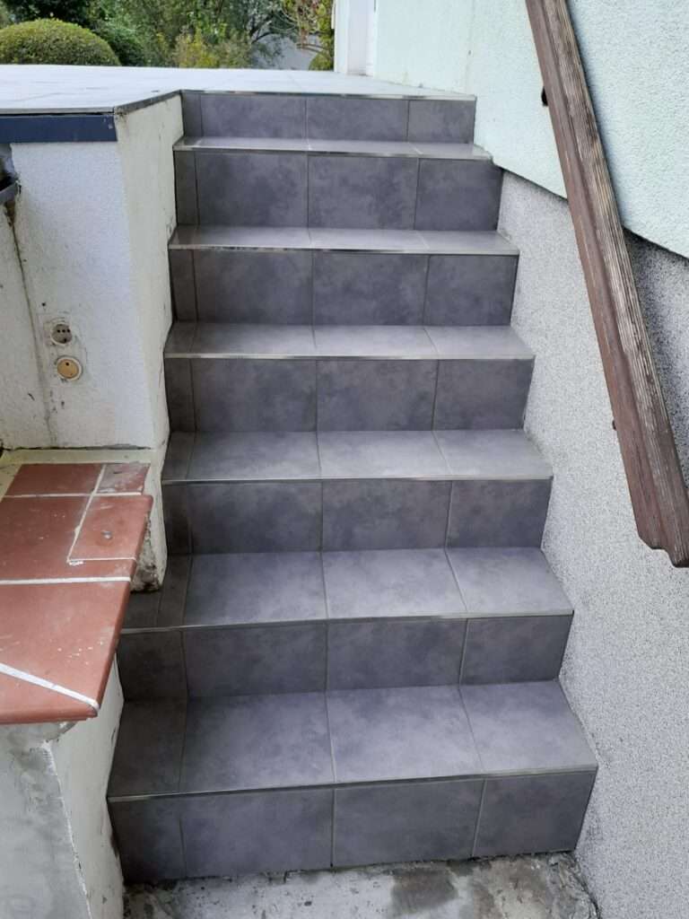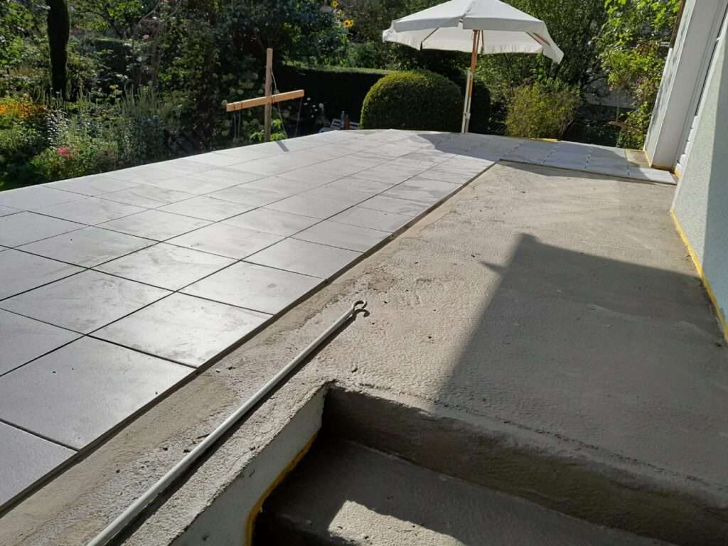 Nach der Vorbereitung verlegten wir graue Spaltplatten mit Mapei S1 Fliesenkleber und verfugten sie mit Mapei Fugenmasse, die speziell für Terrassen geeignet ist. Auch die Stiegen wurden mit den gleichen grauen Spaltplatten ausgestattet und mit einer Schiene an den Kanten versehen. Das Ergebnis ist eine langlebige und ästhetisch ansprechende Terrasse, die sowohl funktional als auch optisch überzeugt.