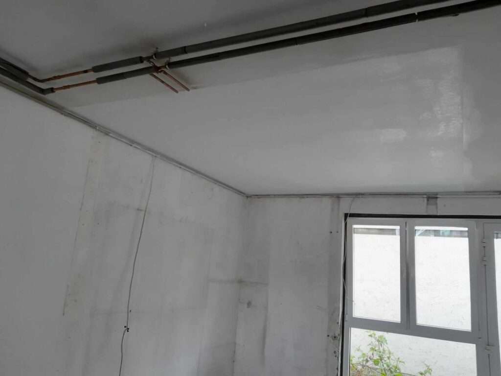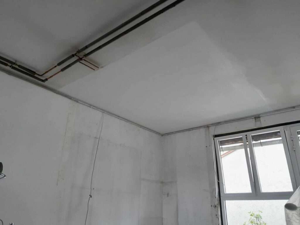 In Salzburg haben wir die Garagendecke umfassend saniert. Zunächst wurde ein Loch mit Feuerschutzplatten und einer stabilen Aluunterkonstruktion doppelt verschlossen. Nach der Montage wurden alle Verbindungen mit Gewebestreifen dreifach verspachtelt und gründlich geschliffen, um eine glatte Oberfläche zu gewährleisten. Abschließend haben wir den gesamten Bereich mit Mapei Haftgrund vorbereitet und zweimal mit Mapei Dursulitte in Weiß gestrichen, um ein sauberes und ansprechendes Finish zu erzielen.